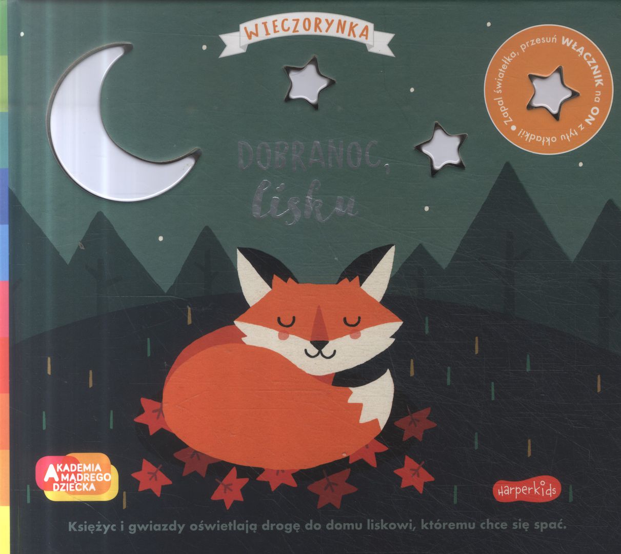 Książeczka ze światełkami Dobranoc lisku z serii Wieczorynka opowiada o małym lisku, który szuka swojego domu, by móc położyć się spać. Gwiazdy i księżyc oświetlają mu drogę. Lisek idąc do domku spotyka różne zwierzątka leśne, które już smacznie śpią. Mały zajączek śpi wtulony w mamę, niedźwiadek, jelonek też śpią słodko pod świecącymi gwiazdami. W końcu lisek słyszy nawoływanie taty i trafia do domku. Wieczorynka to nowa seria świecących książeczek w ramach Akademii Mądrego Dziecka, których celem jest pobudzić zmysł wzroku maluszka. Książeczki z serii Wieczorynka są dobrym sposobem na wyciszenie maluszka przed snem, dzięki spokojnej bajeczce o zasypianiu i stonowanym światełkom.